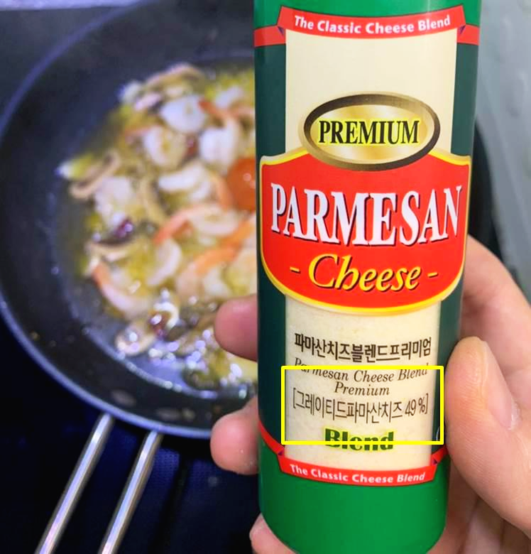 어제 만들었던 감바스 알 아히요를 포스팅을 하기 위해 사진을 정리하던 중 파마산 치즈가루 사진을 보니 엥? 그레이티드 파마산 치즈 49% 함유되었다는 문구를 발견했어요.