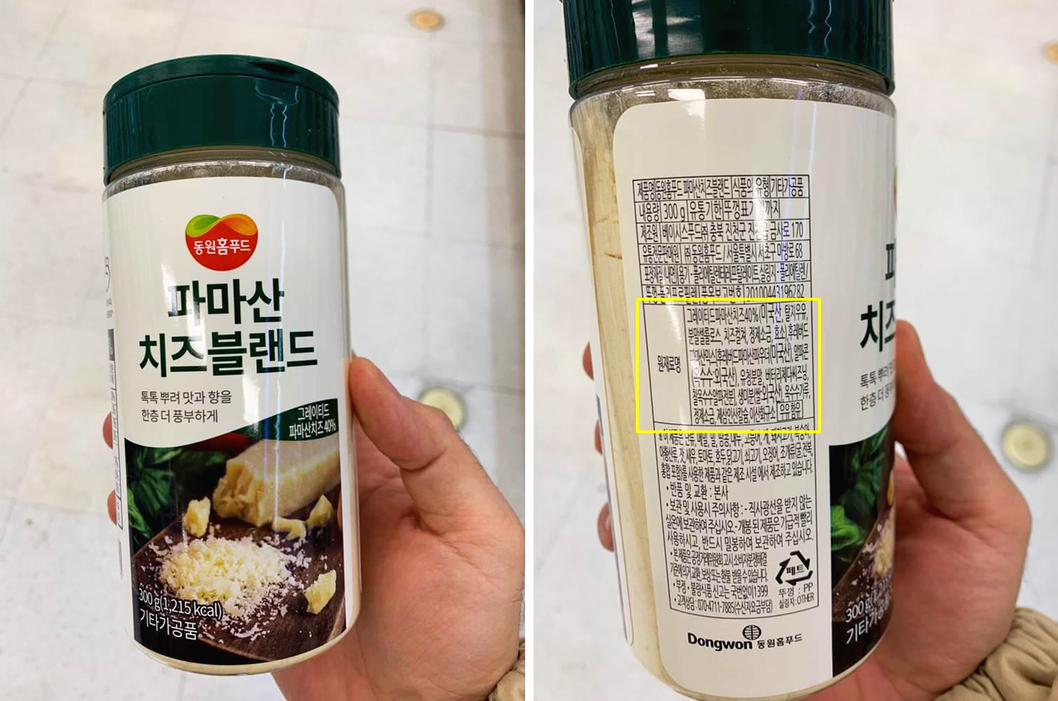 동원홈푸드 파마산치즈블랜드 - 그레이티드파마산치즈 40%(탈지우유, 분말셀룰로스, 치즈컬쳐, 정제소금, 효소), 후레버드파마산믹스, 알파콘, 유청분말, 버터리체다씨즈닝, 찰옥수수알파전분, 생미분, 옥수수가루, 정제소금, 제삼인산칼슐, 이산화규소