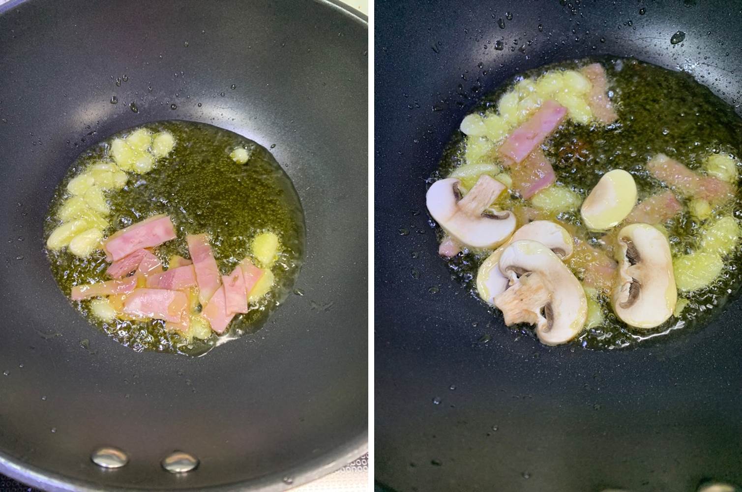 마늘의 색이 바뀌면 베이컨과 양송이버섯, 양파를 넣어서 잘 볶아줍니다. 베이컨이 바삭하게 익는 게 좋으신 분들은 처음 마늘을 볶을 때 먼저 넣어주시는 게 좋아요. 저는 정신없이 준비하다 보니 양파를 빼먹은걸 나중에 알았어요.