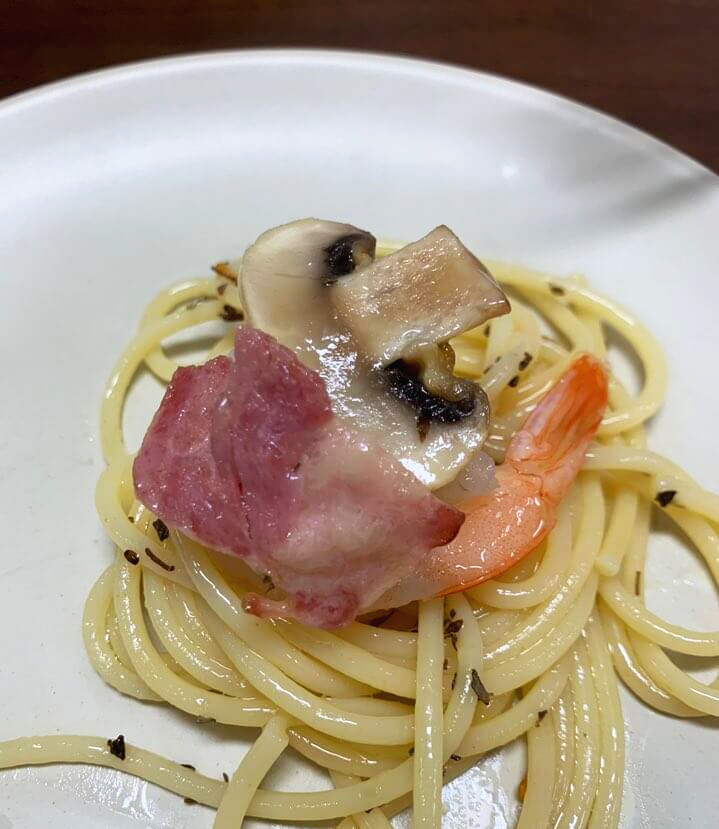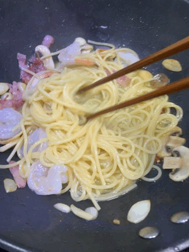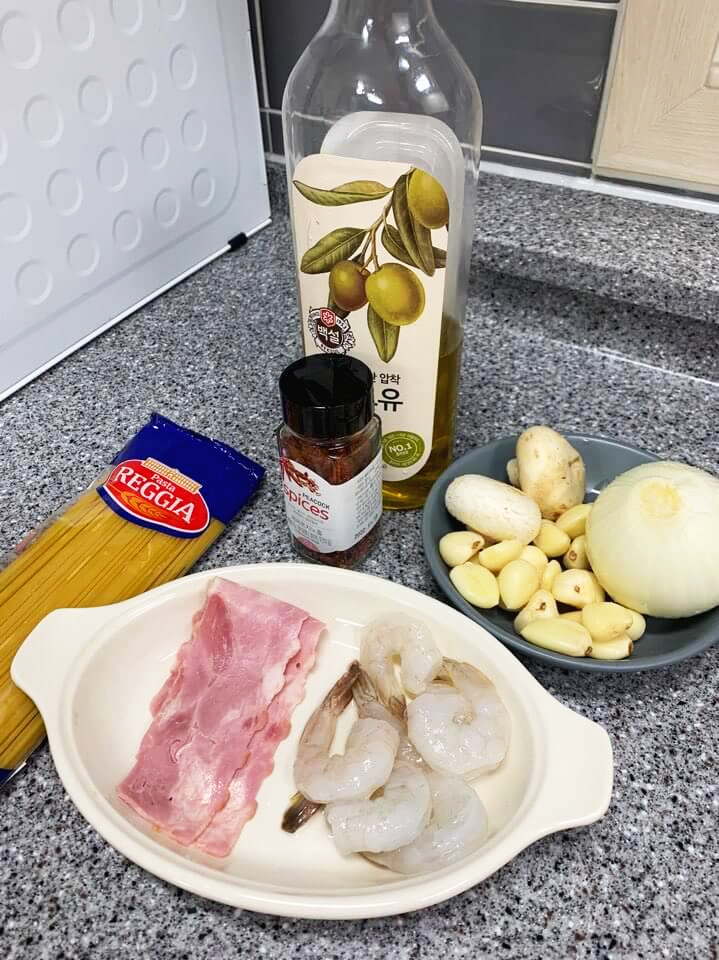 스파게티면, 새우 5마리, 마늘 7개, 페퍼론치노 4개,