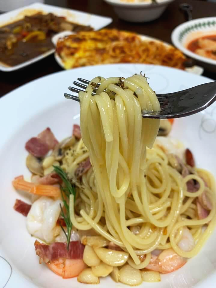 한 수저 떠봅니다. 마늘향의 머금은 파스타가 너무 맛있습니다.