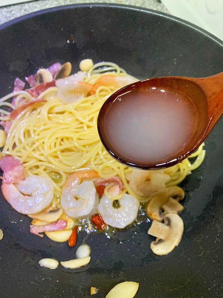 어느 정도로 면이 익었으면 불을 끄고 파스타를 삶았던 면수를 2~3스푼 넣어줍니다. 그리고 힘차게 잘 저어줍니다. 웍질을 잘하시는 분들은 웍질을 해주시면 더 좋다는데 저는 웍질이 서툴려서 젓가락으로 막 저어주었습니다.