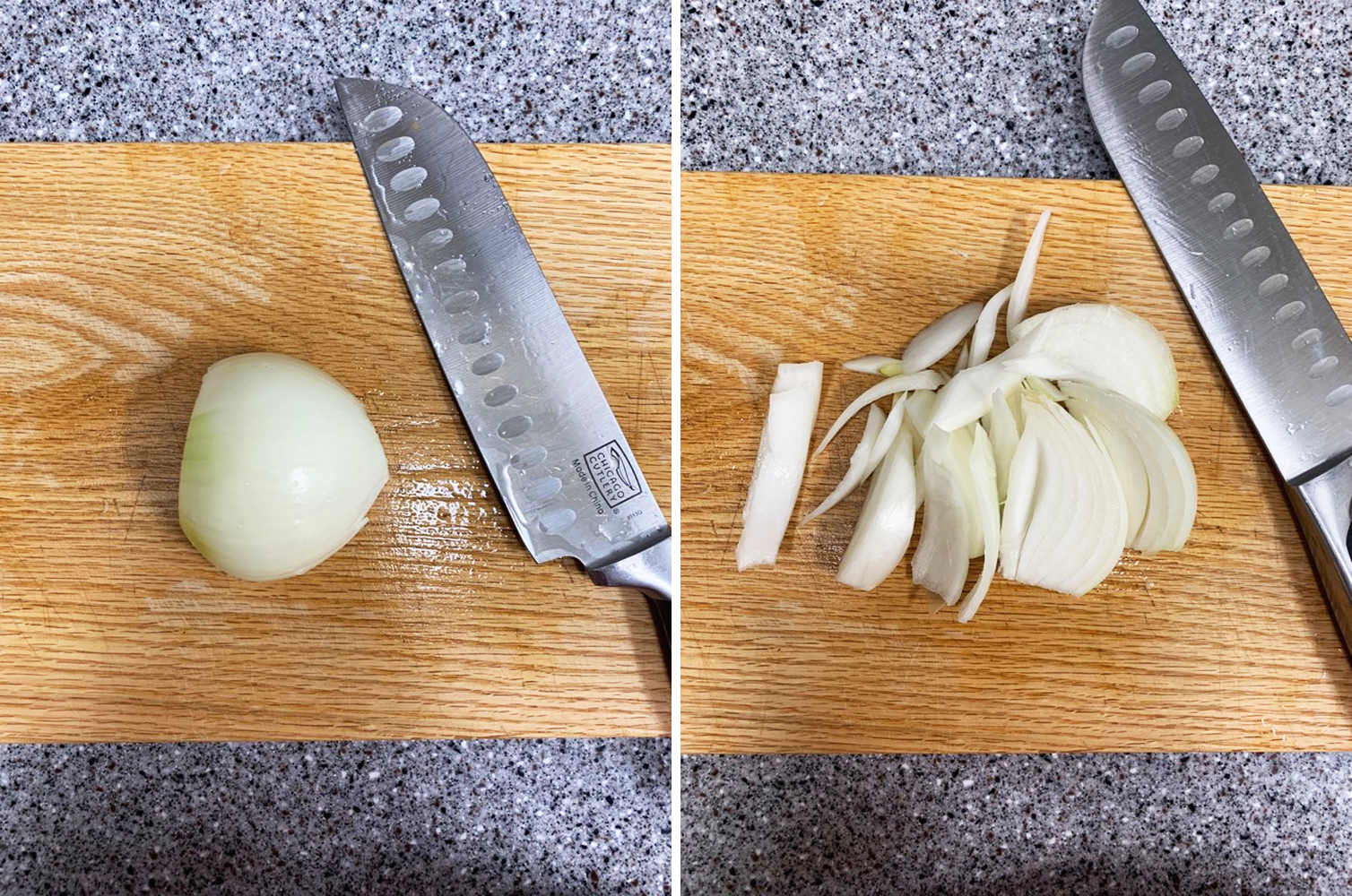 양파와 베이컨도 먹기 좋은 크기로 썰어줍니다. 사실 베이컨은 없어도 되지만 조금 더 맛을 내기 위해 넣었어요. 다른 버섯들이 있으시면 넣으셔도 좋아요.
