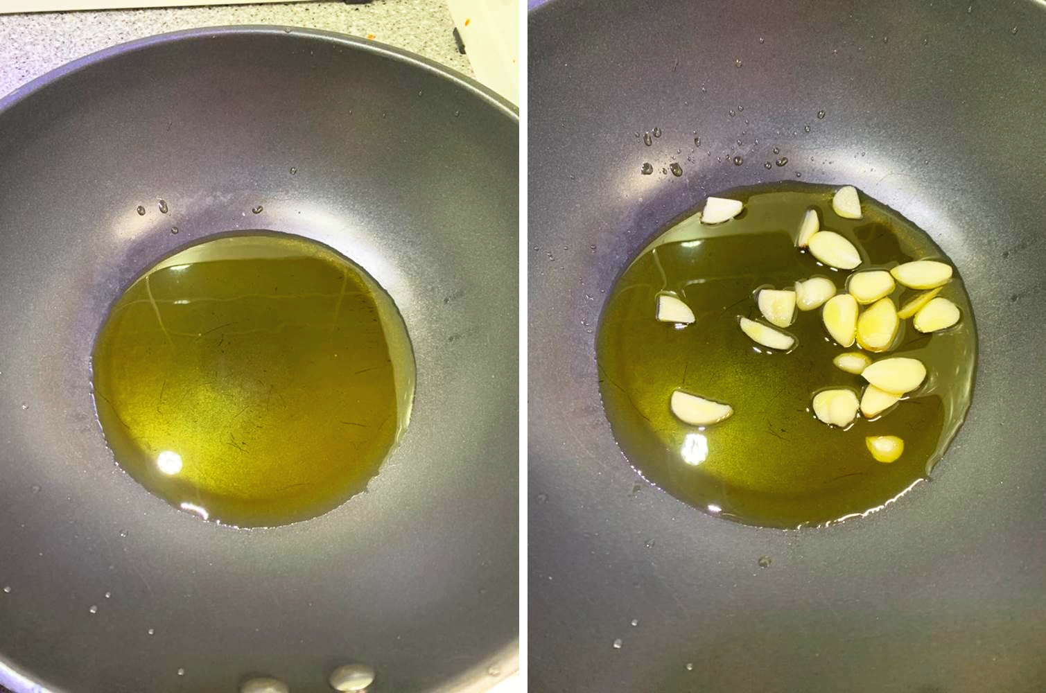 올리브 오일을 넉넉히 넣고 편으로 썬 마늘과 함께 약불에서 마늘을 노릇하게 익혀줍니다.