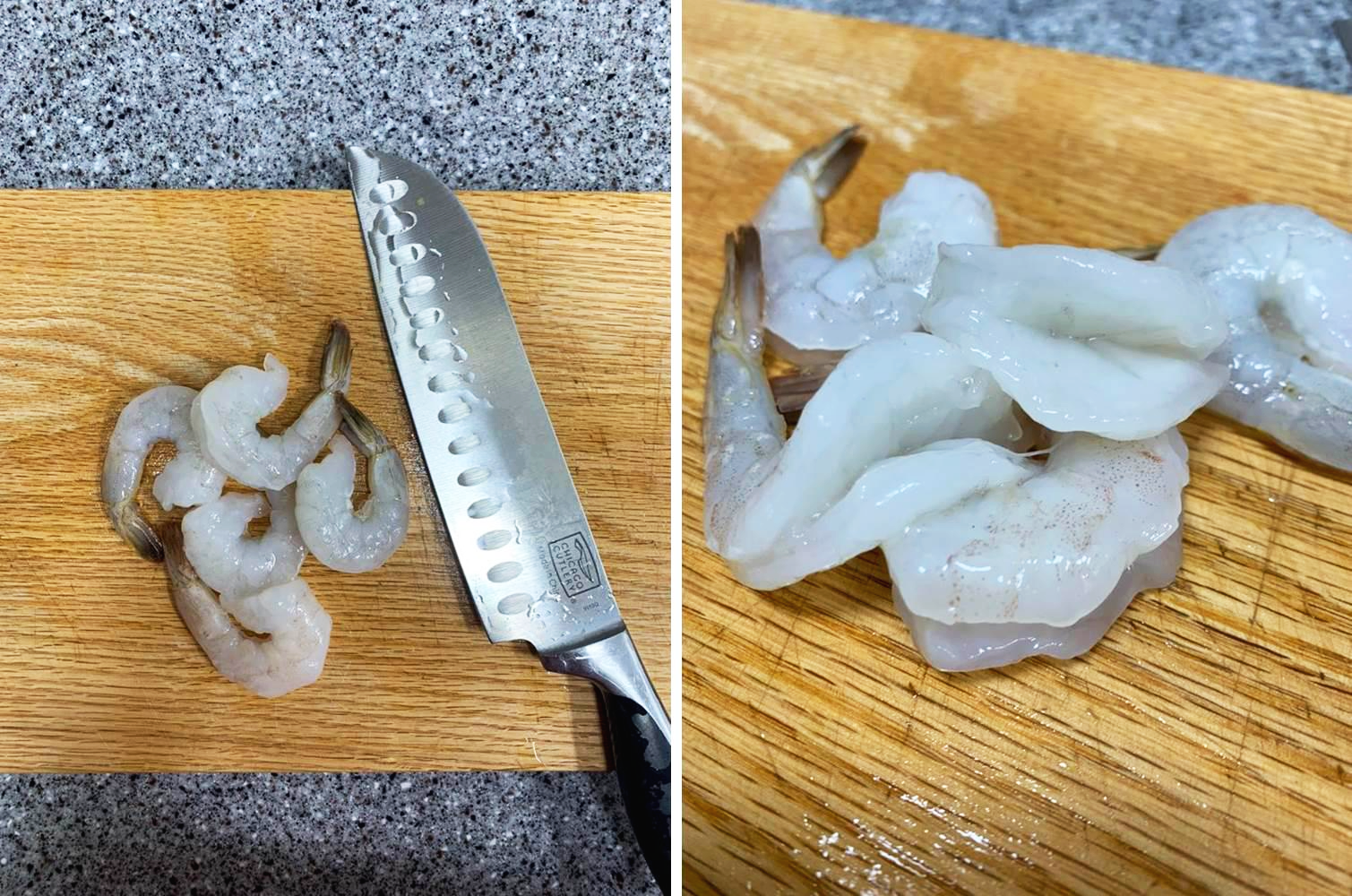 저는 껍질이 제거된 냉동 깐 새우를 사용했습니다. 생새우를 이용하실 분들은 머리와 껍질을 제거하고 준비해주세요. 나중 새우가 익었을 때 모양을 위해 새우의 등에 칼집을 넣어 주었습니다. 안 하셔도 상관없습니다.