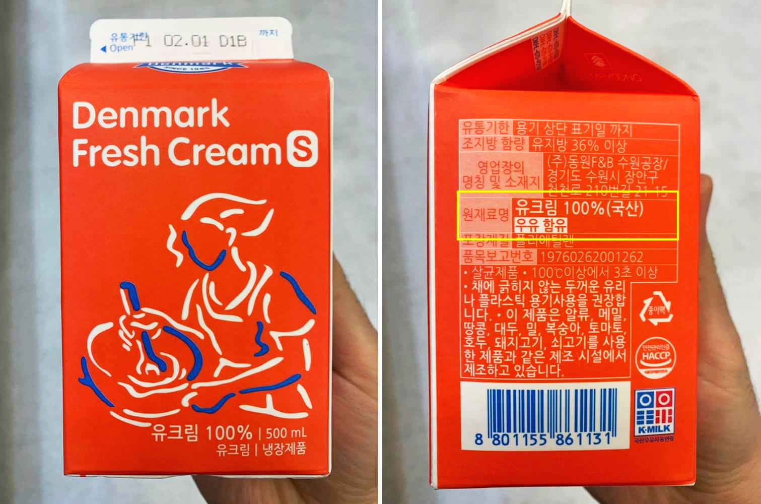 생크림은 순수 우유지방으로 되어 있어 고소하고 풍미가 있지만 보관기간이 짧아 사용 후 애매하게 남은 경우 비싼 가격임에도 버릴수 밖에 없습니다. 이럴 때 유지방 함량을 확인해 동물성 휘핑크림을 사용하면 약간의 인공적인 맛이 나긴 하지만 보관기간도 길고 맛도 괜찮을 것 같네요.