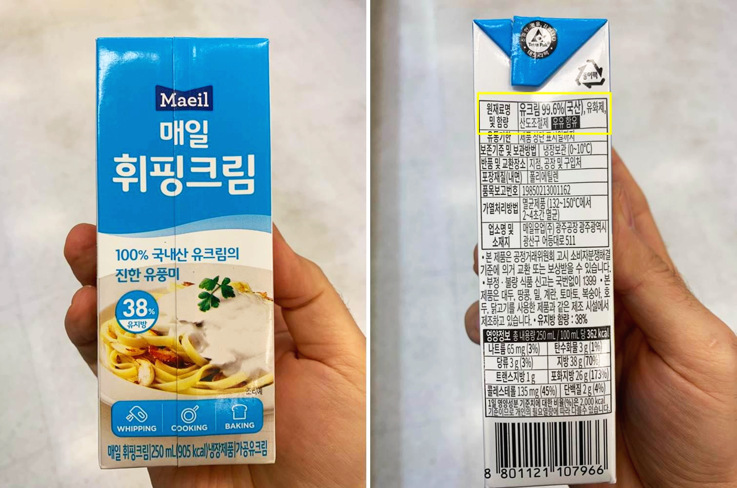 매일 휘핑크림 - 유크림 99.6%(유지방 38%), 유화제, 산도조절제.(동물성 휘핑크림에 해당될 것 같습니다.)