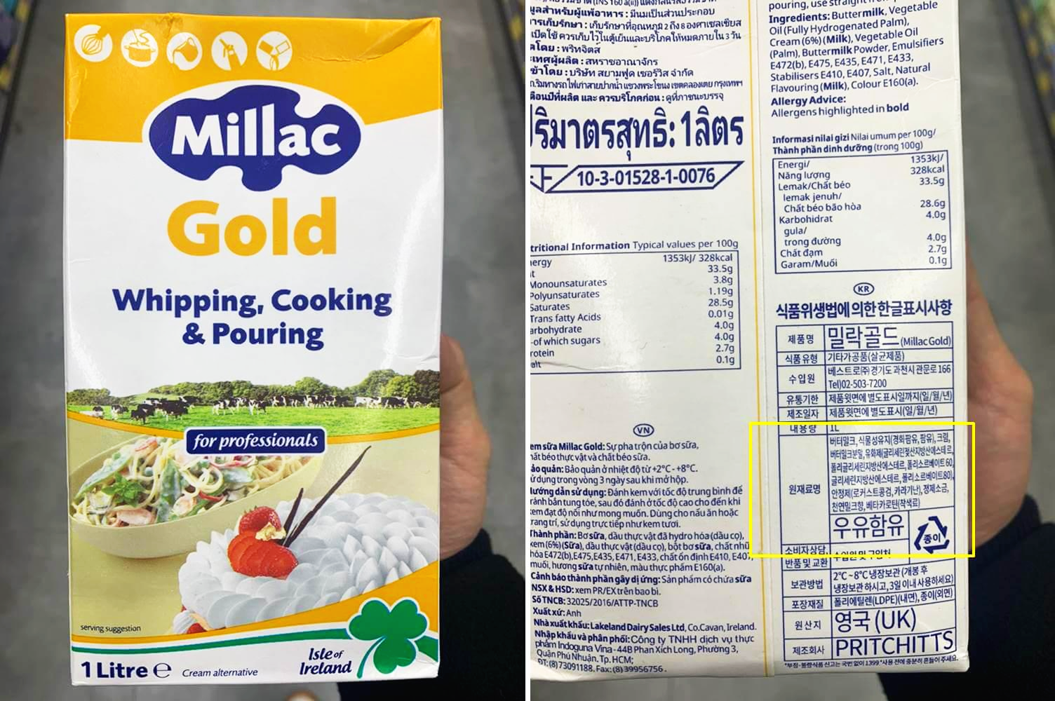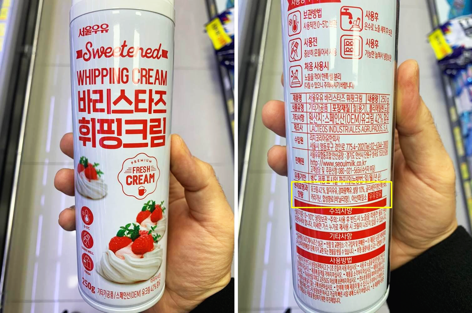 서울우유 바리스타즈 휘핑크림 - 유크림 42%, 탈지우유, 경화팸핵유, 설탕 10%, 글리세린지방산에스테르, 카라기난, 합성향료, 아산화질소