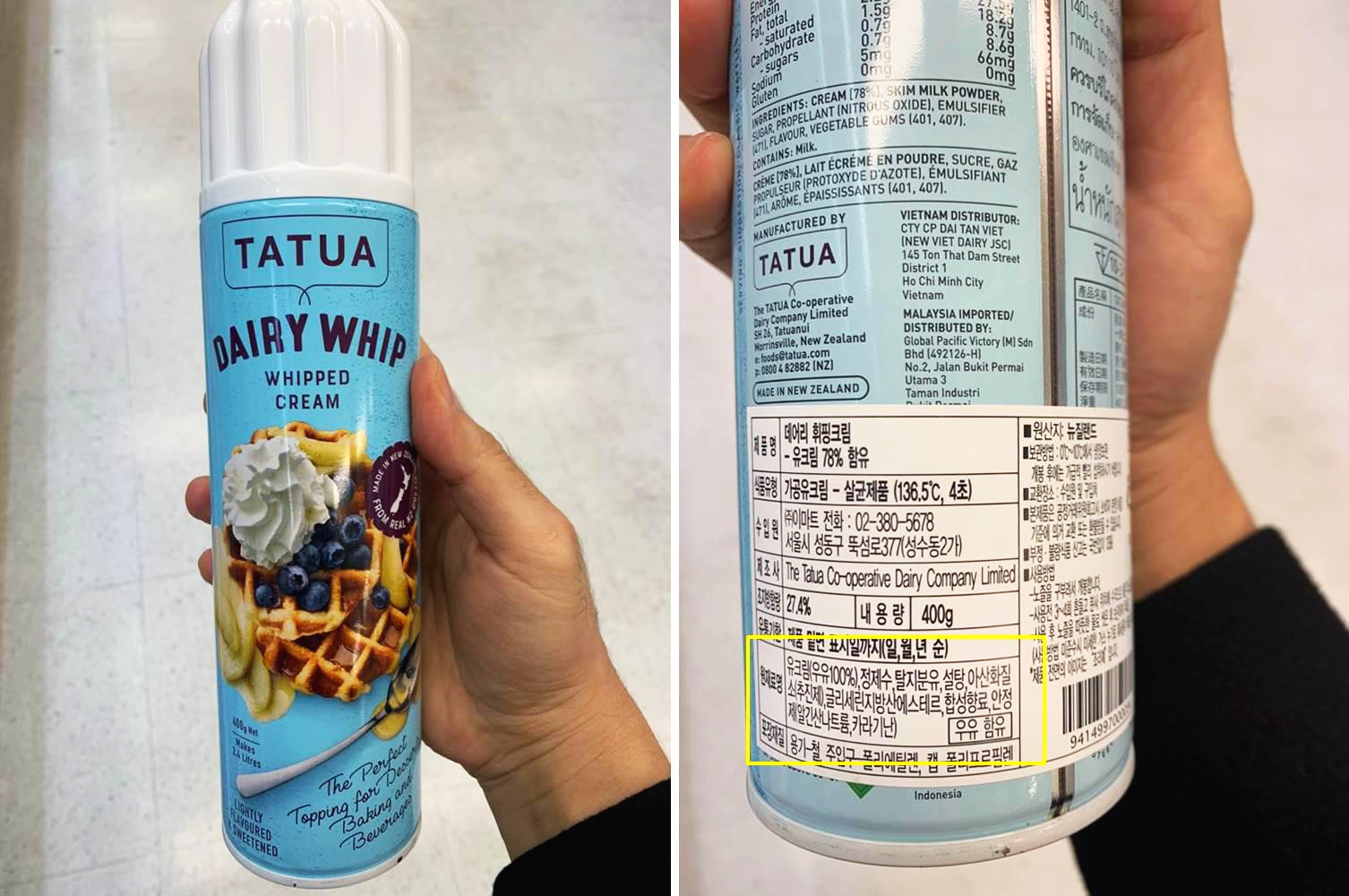 데어리 휘핑크림(휘피드 크림) - 유크림, 정제수, 탈지분유, 설탕, 아산화질소, 글리세린지방산에스테르, 합성향료, 안정제일긴산나트륨, 카라기난
